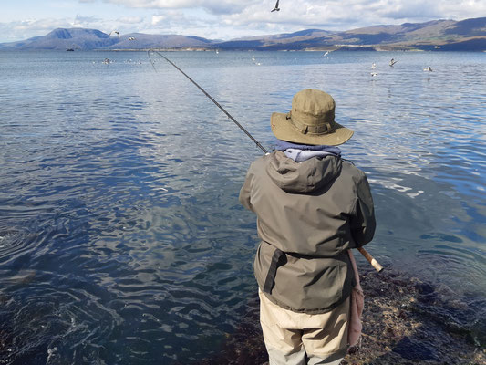 On the 26th, Mike moved back to Ross to spend the weekend with Jim. I headed down to join them for the afternoon on the 27th. Mike was just setting up on "my" spot on the east side of the lagoon having had a decent fish there the previous evening. He said there were some mullet in the shallows to our right but he thought they would move this way as the tide dropped. It seemed a reasonable enough idea so I set up next to him.